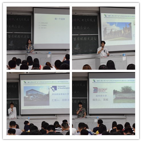 下午4点30分,交流会正式开始。首先由来自14级通信专业的满雯怡——即将就读于香港城市大学,作为开讲人。满雯怡分享了自己的留学经验,强调无论做出何种选择,都是在为梦想努力奋斗,并建议有出国考研意愿的同学要提早做准备,在大学期间要保持优异的成绩并达到一定的语言要求。第二位是14级自动化专业的高柳洋,他即将就读于英国南安普顿大学,他向同学们详细强调了选择专业的重要性,讲解了不同国家留学考试制度以及留学国家的选择问题。第三位是来自14级自动化专业的孙英捷——即将就读于英国的利兹大学,他分别从留学准备的前期、中期和后期三个阶段,详细介绍了留学所需要具备的能力,并认为做人要有恒心,要积极的克服困难,勇攀高峰。最后一位主讲人为15级电气中外的吴炫,现已成功申请美国底特律大学,他从国外的教育、安全、所需费用、学历学位认证等方面分享了出国留学的具体情况。