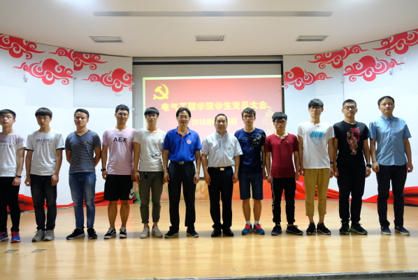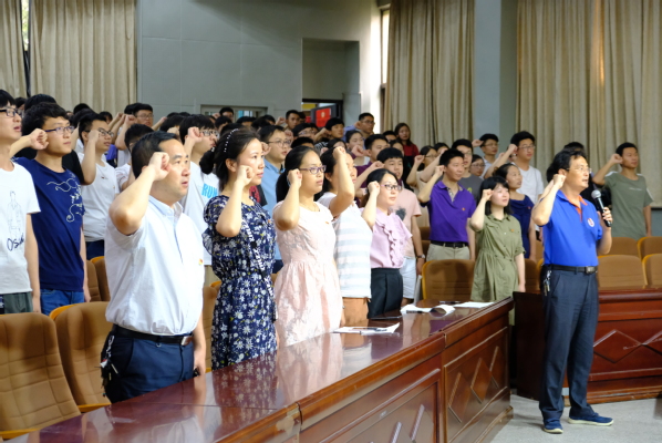 在铿锵有力的国歌声中,学生党员大会正式拉开帷幕。郭全根带领全体学生党员进行新党员入党宣誓暨老党员重温入党誓词。面对鲜红的党旗,大家高举右手,发出铮铮誓言。随后,郭全根和陆华才为新发展入党的学生党员代表佩戴党员徽章。