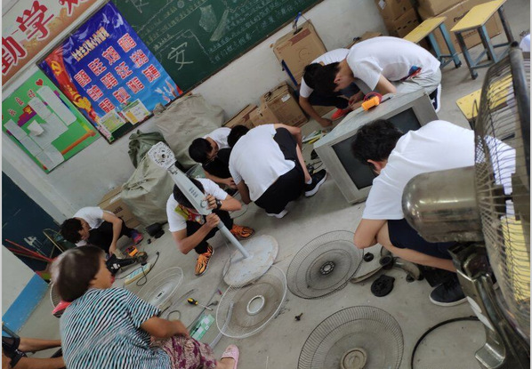在鸭湖村小学教室里挤满了前来维修小家电的村民,“科技扶贫小分队”开展家电维修及置换服务项目的同学们义务为村民维修家用电器。同时,为了助力脱贫攻坚战略任务的实现,落实好学校关于定点帮扶工作任务安排,根据校团委和学院党委的统一部署安排,在以往家电维修的基础上,增加家电置换项目,这一行动得到了校友企业广东瑞德智能科技股份有限公司的大力支持,重点针对贫困村、贫困户,开展老旧家电免费以旧换新活动把专业的维修技术与实实在在的关怀帮扶送到基层,深受当地群众的欢迎,村民们纷纷向现场的师生竖起了大拇指
