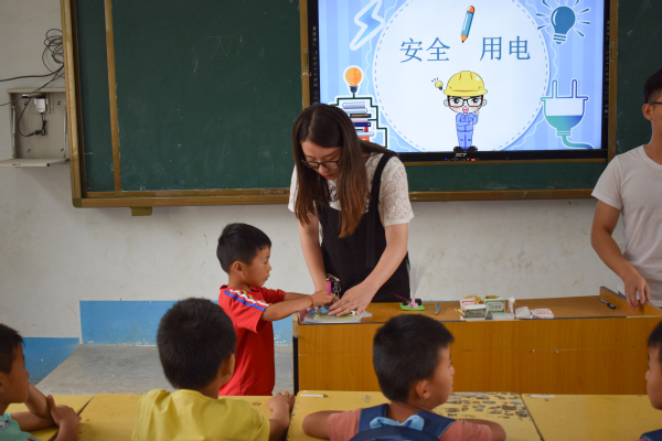 “用电安全宣传”科技扶贫小分队的同学们兵分两路,一部分在鸭湖村小学教室里,向小学生们讲解水果电池组装、光纤灯、红绿灯等电学科普玩具制作,宣传用电安全知识及电力安全歌、安全标识等