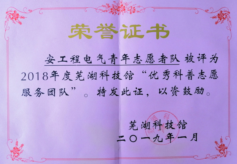 近日,在芜湖科技馆2018年“优秀科普志愿者”和“优秀科普志愿服务团队”评选中,小说狂人 团委学生会青年志愿者队获得“优秀科普志愿服务团队”称号,其中8名志愿者者获得“优秀科普志愿者”称号。1月13日,部分志愿者代表参加了芜湖科技馆的青年志愿服务表彰大会。志愿者们表示,今后将会继续努力,让持续了六年的科技馆科普志愿活动传承下去,带动电气学子积极投身其中,感受志愿服务的温暖和乐趣,让志愿服务的奉献精神薪火相传!