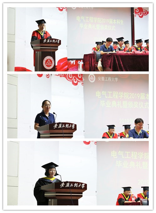 典礼上,教师代表黄宜庆、辅导员代表吉萌分别为毕业生们赠言。他们回忆师生情深的难忘时刻,表达了对毕业生的美好祝福。希望毕业生们要做有理想、有本领、有担当的人;要转换好角色、规划好道路,踏踏实实从每一件小事做起;在未来的人生旅途中不断收获精彩,书写人生最为华美的篇章。毕业生代表建电151班夏慧娟发表了毕业感言,她分享了自己在大学四年的收获与感悟,表达对美好校园生活的留恋,对学院及老师的衷心感谢,对母校的真诚祝愿。并表示在未来的道路上,将秉承校训精神,勇担时代重任,勇做奋进者、开拓者、奉献者,让奋斗成为青春最亮丽的色彩。