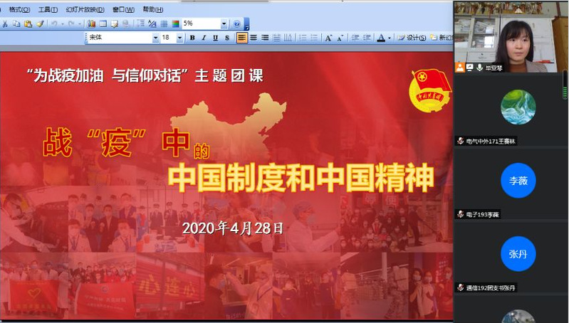 电气研团支部积极响应学院要求,运用网络平台采取线上会议的形式,推进“为战疫加油,与信仰对话”主题团课覆盖到全团支部团员青年。让同学们了解了此次疫情中国的大国担当和显现出的中国力量,让同学们了解到了“疫情”大考后的青年担当。
