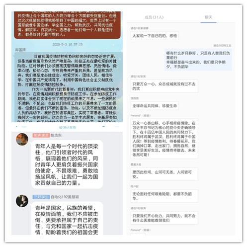 电子171团支部在开展主题团课的同时,还在线上进行了讨论。大家都表示作为新时代的青年要坚定必胜的信念,持续用力,以“不破楼兰终不还”的拼劲,毫不放松做好个人疫情防护工作,积极参加志愿服务活动,为赢得这场战役的全面胜利而顽强拼搏。