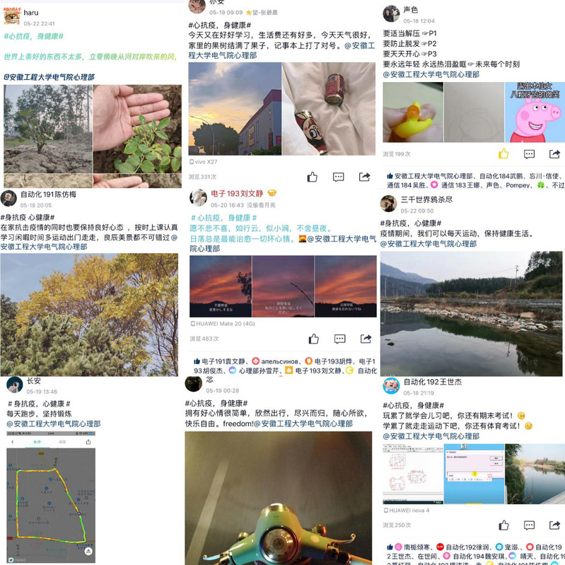 本次心理健康月活动是在疫情背景下线上组织开展的,同学们积极参与,分享他们宅家的快乐生活,进一步增强大学生心理健康意识,提高学生情绪管理和心理疏导等能力。