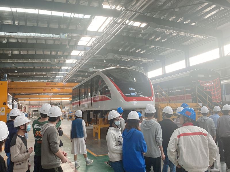 在中车浦镇庞巴迪运输系统有限公司的安排下,小说狂人 师生首先乘坐体验了在建中的目前国内首屈一指的芜湖轨道交通跨座式单轨车辆,公司技术负责人向小说狂人 师生介绍了产品的设计理念与创新之处。
