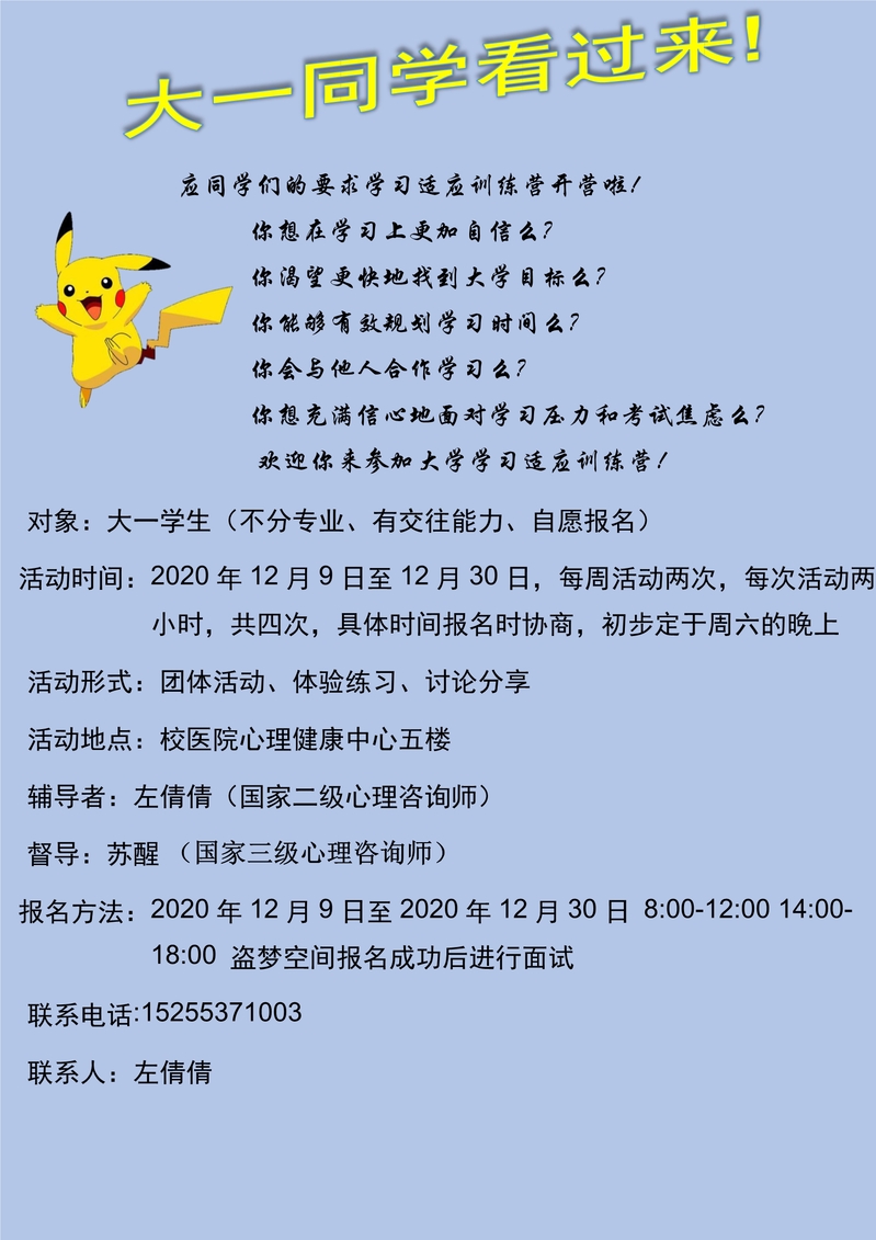 “大一新生学习适应训练营”团体辅导活动。为帮助2020级新生解决学习适应不良问题,小说狂人 组织学生开展了“大一新生学习适应训练营”的团体心理辅导活动,活动一方面增加了同学之间熟悉度和信任度,同时使大家在应对各种困难、挑战,解决问题的过程中,认识群体的作用,增进对集体的参与意识与责任心,另一方面有助于学习不适应的大一新生获得安全感,提升个人能力,调整身心状态尽快适应大学学习生活。