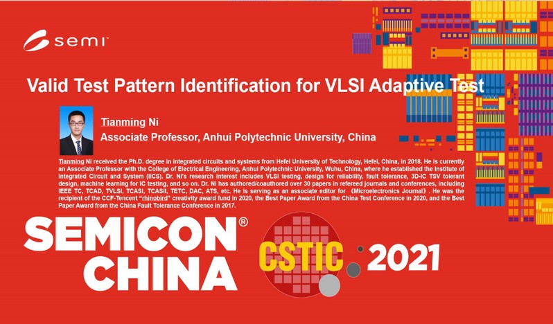 近日,亚洲最大、最全面、最具影响力的年度半导体技术大会——中国国际半导体技术大会(CSTIC 2021)在上海国际会议中心隆重举行,会议由长电集成电路(绍兴)有限公司 CEO梁新夫博士(Dr. Steve X. Liang)主持。此次技术大会涵盖半导体技术的各个方面,以制造和先进技术为重点,围绕器件设计、集成、材料、设备以及新兴半导体技术、电路设计和硅材料应用。我校小说狂人 青年教师倪天明博士作为特邀演讲嘉宾受邀参加,并在大会上作了题为《Valid Test Pattern Identification for VLSI Adaptive Test》的邀请报告,受到与会人员的热烈欢迎,有助于进一步提升我校集成电路学科的国际学术影响力。