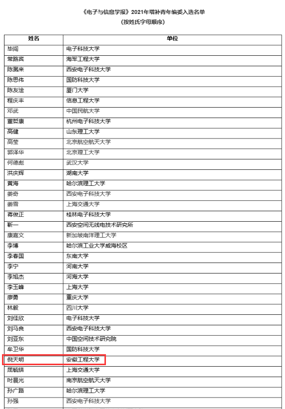 近期,根据《电子与信息学报》期刊官网显示,我校倪天明副教授从161名青年专家中脱颖而出,成功入选2021年《电子与信息学报》青年编委,是全国少数来自“双非”高校的青年教师,同时也是安徽省内唯一入选的青年学者。