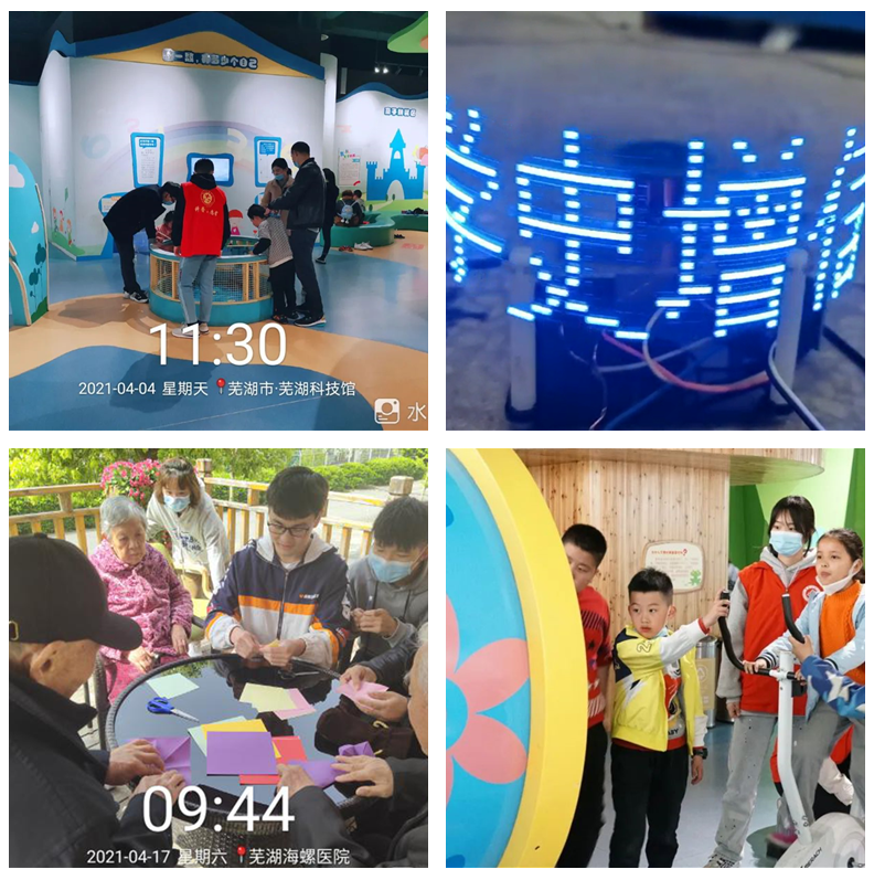 学院立足实际,结合正在开展的“百花献礼”暨党史学习教育劳动月活动,融合学院学科专业发展特色,立足现有11个校级“团百花”学雷锋志愿服务项目,系统总结经验做法,创新方式与载体,组织开展“致敬百年,争做新时代雷锋”主题志愿服务活动。4月4日,“望日莲”芜湖科技馆科普志愿服务项目的8名志愿者来到科技馆开展志愿服务活动;4月11日,“凌霄花”趣味小课堂志愿服务项目再次走进芜湖科技馆;4月17日,“晚香玉”慰问空巢老人志愿服务项目来到芜湖海螺医院开展第四次小组活动;4月30日,“满天星”家电维修进万家志愿服务项目精心制作的党史学习教育科普展示成功上线。