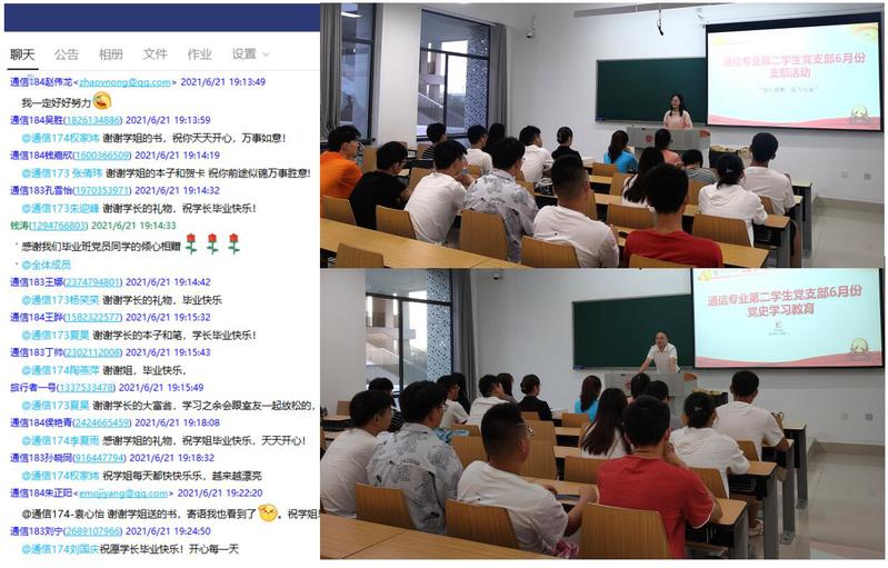 6月21日下午,通信专业第二学生党支部在国际工程师学院X303教室开展了“倾心相赠,接力传承”主题党日活动。18级支部全体党员及毕业生党员代表参加。活动由支部书记钱涛主持。