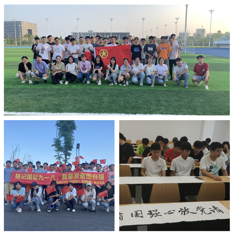 自动化194团支部开展“勿忘国耻,纪念九·一八”签名宣誓活动,同学们在印有“铭记国耻九·一八、我辈发奋图自强”的横幅上签下自己的名字。电气194团支部举办书法比赛,同学们以宿舍为单位,用毛笔书写爱国情怀。电子194团支部带领同学们走上操场,开展主题团建活动,增进了同学们的感情,提高了团支部凝聚力。自动化192团支部在观看爱国题材电视剧《觉醒年代》后,以“请党放心 强国有我”为主题展开分组讨论。