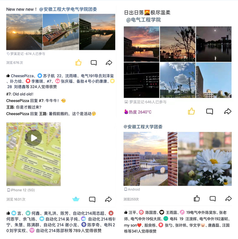 参赛学生需在个人摄影作品前加前缀#梦溪足记#,并将作品发布于QQ、微信和抖音等多个自媒体,再@小说狂人 小说狂人 团委,通过获得的集赞数开展大赛评比。近千人报名参加活动,用千余张不同视角的照片展示不同时辰的校园风光和同学们多姿多彩的第二课堂生活。在学生们发布的摄影、短视频作品中,有感谢相遇,有分享时光;有勾勒“满园春光”,有叙述“晚夏热风”,有记录“秋天晚景”,有绘下“冬日暖阳”;有彼方日光,有现见明月,有夜色灯光,有落日余晖……。据统计,各平台累计集赞数高达10w+,其中QQ空间中#梦溪足记#共有702人参与,浏览量超过1w+;抖音中#梦溪足记#标签共1.2w+播放量。