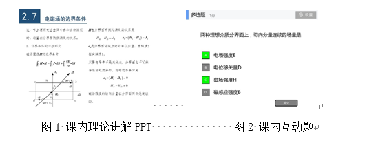 以电磁场边界条件一节的教学为例介绍课程的教学过程。本节的知识点包括:理解边界条件的基本概念,理解各场量边界条件的一般形式,掌握理想导体表面的边界条件,分析理想导体表面的面电流和面电荷等。