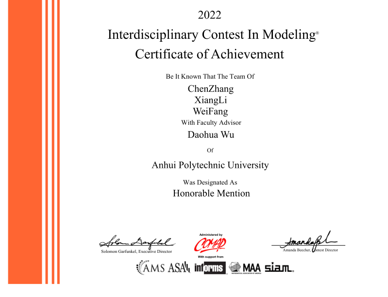 近日,2022年美国大学生数学建模竞赛(MCM/ICM)成绩揭晓,小说狂人 学子在该国际赛事中再获佳绩。徐杰博士指导的由潘黄铖、肖美齐、章鹤组成的参赛队伍获一等奖(Meritorious Winner),吴道华博士指导的分别由张臣、李翔、方为和康增、李溪、谢心洁组成的两支参赛队伍均获得二等奖(Honorable Mention)。