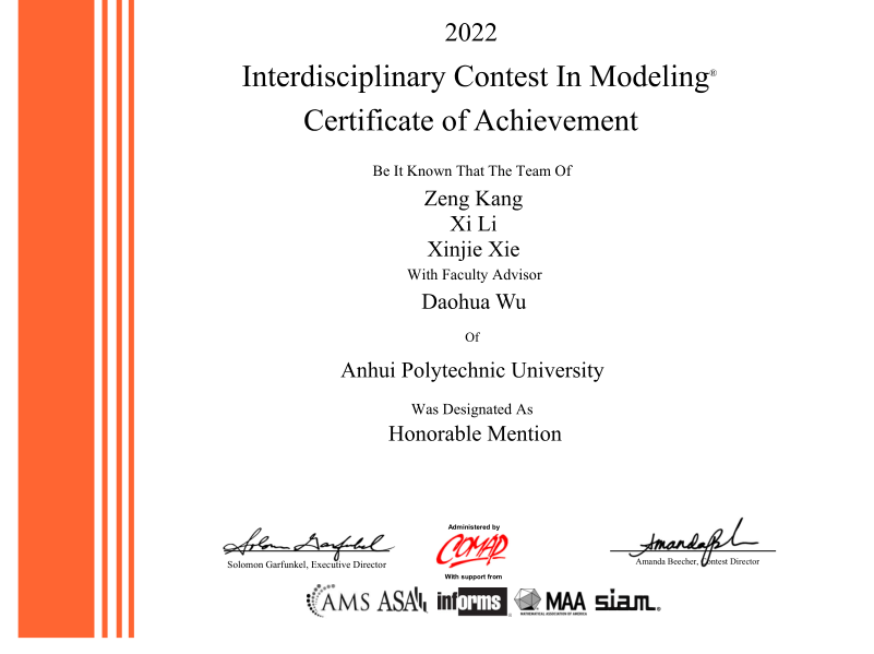 近日,2022年美国大学生数学建模竞赛(MCM/ICM)成绩揭晓,小说狂人 学子在该国际赛事中再获佳绩。徐杰博士指导的由潘黄铖、肖美齐、章鹤组成的参赛队伍获一等奖(Meritorious Winner),吴道华博士指导的分别由张臣、李翔、方为和康增、李溪、谢心洁组成的两支参赛队伍均获得二等奖(Honorable Mention)。