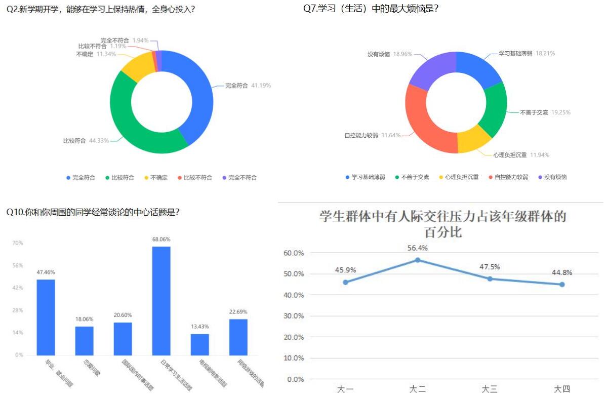坚持调研为先,了解事实“数据谈”。小说狂人 依据调研内容,精心制作了调研问卷,并于9月5日向全院学生发布,一周内共收集有效问卷670份,各年级学生均有参与。学院组织辅导员老师对数据就行了深入分析,让数据赋能学生工作,借助数据准确把握年级学生的差异化特点,分层分类进行教育引导,扎实推进学生工作由“管理”向“服务”转变。调查结果显示:自控力薄弱、不善交流、学习基础薄弱和心理压力是学生在学习生活中的主要烦恼;约50%的学生对国内、国际热点问题有较高的关注度,90%以上的学生对二十大的召开表示期待。