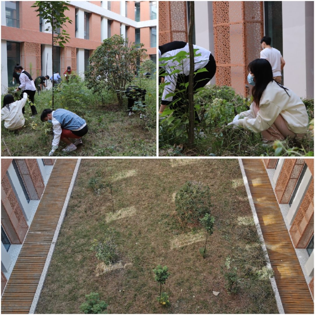 活动开始前学院指导老师向志愿者们介绍活动的主要内容,并对场地花草树木分布情况、杂草辨认、劳动区域划分进行简单介绍。志愿者们到达各自责任区域,戴上工作手套和口罩,领取劳动工具,开始行动。活动现场一派火热,同学们有条不紊、分工有序;从清理石块、碎石到清理杂草树枝、刨根松土……一步步全身心投入整个劳动中。经过2个多小时的奋斗后,草坪上的杂草得到了清除,整个草坪看起来更清爽、利落,其他绿化植物可以更加茁壮成长。