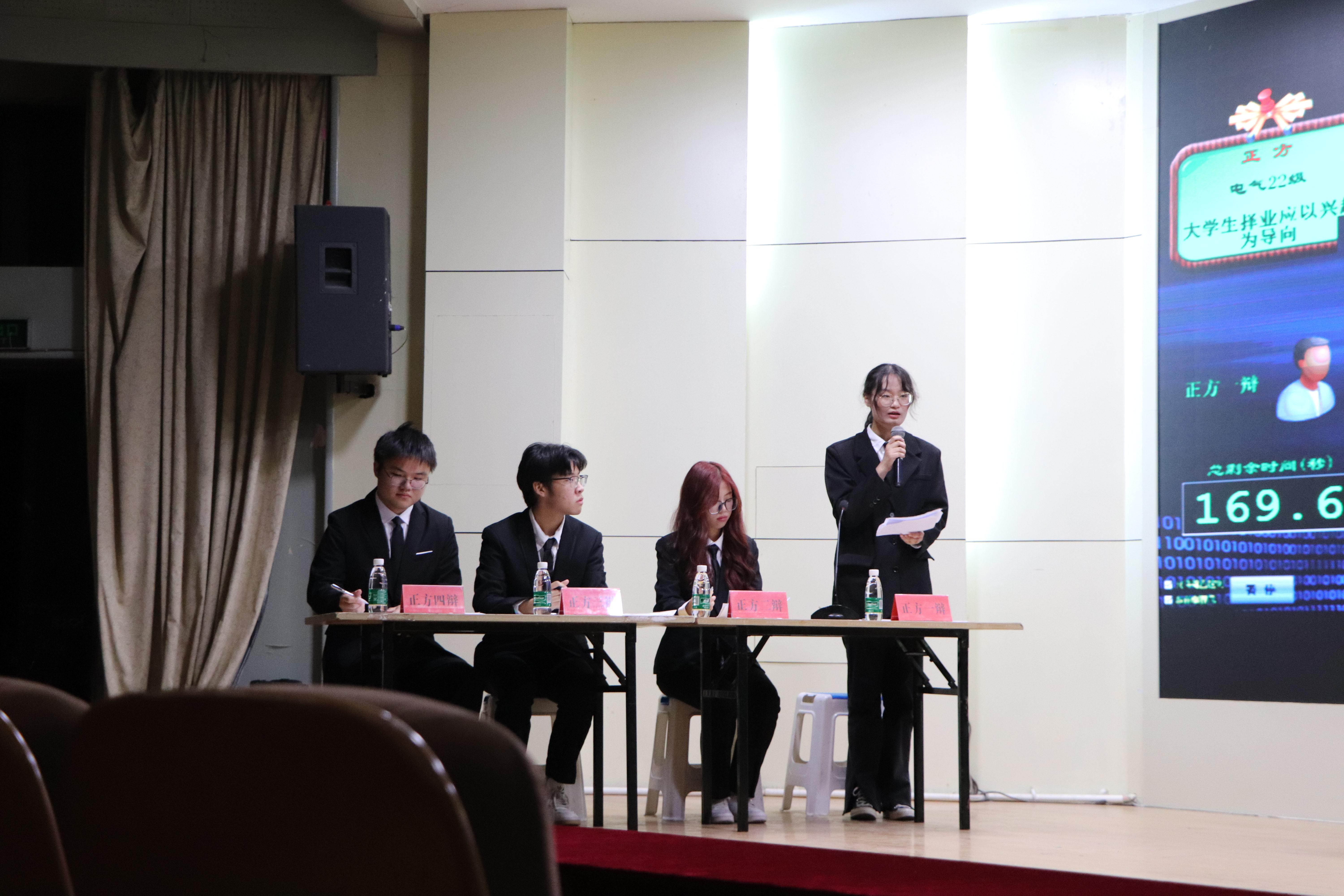 首先打响的是季军争夺战,电气22级代表队和电科22级代表队围绕“大学生择业应以兴趣还是合适为导向”这一辩题展开。双方辩手围绕主题和己方中心论点,各抒己见、侃侃而谈。在自由辩论环节,双方你来我往、针锋相对、紧张气氛迅速升温,辩论精彩不停,掌声不断。