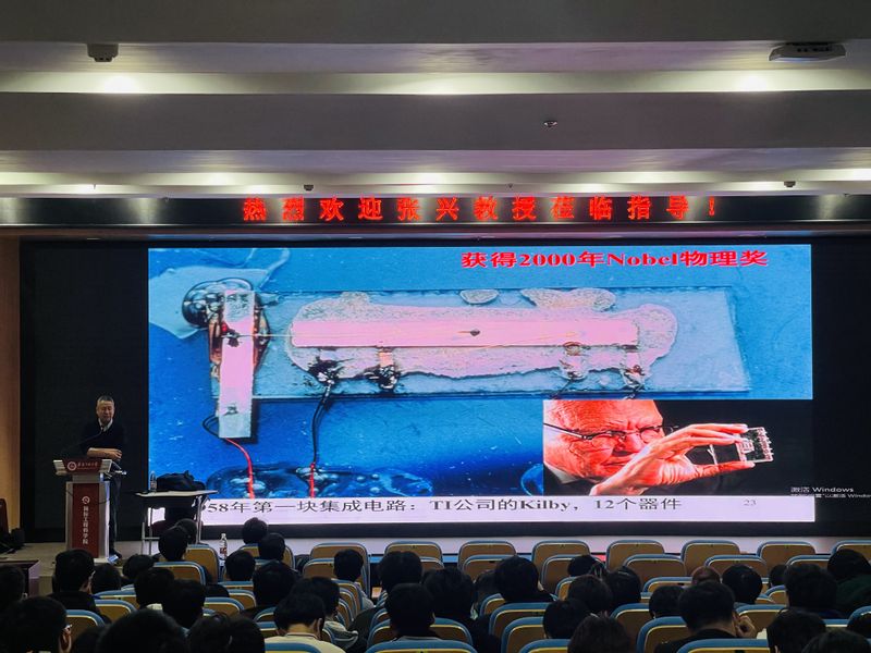 报告伊始,张兴教授将集成电路以直观的画面呈现给在场师生,并介绍了集成电路的基本概念、发展历程以及在现代信息社会中的重要地位。之后,他深入浅出地讲解了集成电路的历史由来、研究现状、关键技术等方面的知识,举例说明了集成电路在通讯、计算机、医疗等领域的广泛应用。此外,张兴教授还对国内集成电路的行业发展进行了分析,分享了自己的研究心得和经验,为学生们指明了研究方向和未来发展趋势。