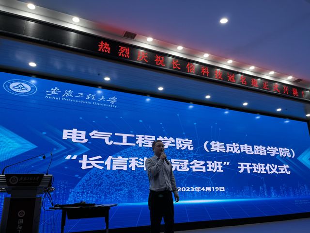 江明代表学院对出席仪式的领导和嘉宾表示衷心感谢和热烈欢迎,并介绍了学校办学历史以及近年来学校和学院建设发展情况。他表示,冠名班是芜湖市紫云英人才计划的重要组成部分,是进一步深化产教融合、校企合作、协同育人的重要举措。冠名班的成立是校企实现深度合作的标志,学院将以此次冠名班开班为契机,进一步发挥高层次应用型本科人才培养优势,围绕产业技术和人才需要,在产学研、人才培养、平台建设等方面和长信科技开展全方位、宽领域的合作。同时,他希望冠名班学员能够抓住机遇,认真学习专业知识,刻苦训练专业技能,强化动手实践能力,练就真本领,以实际行动回报社会。