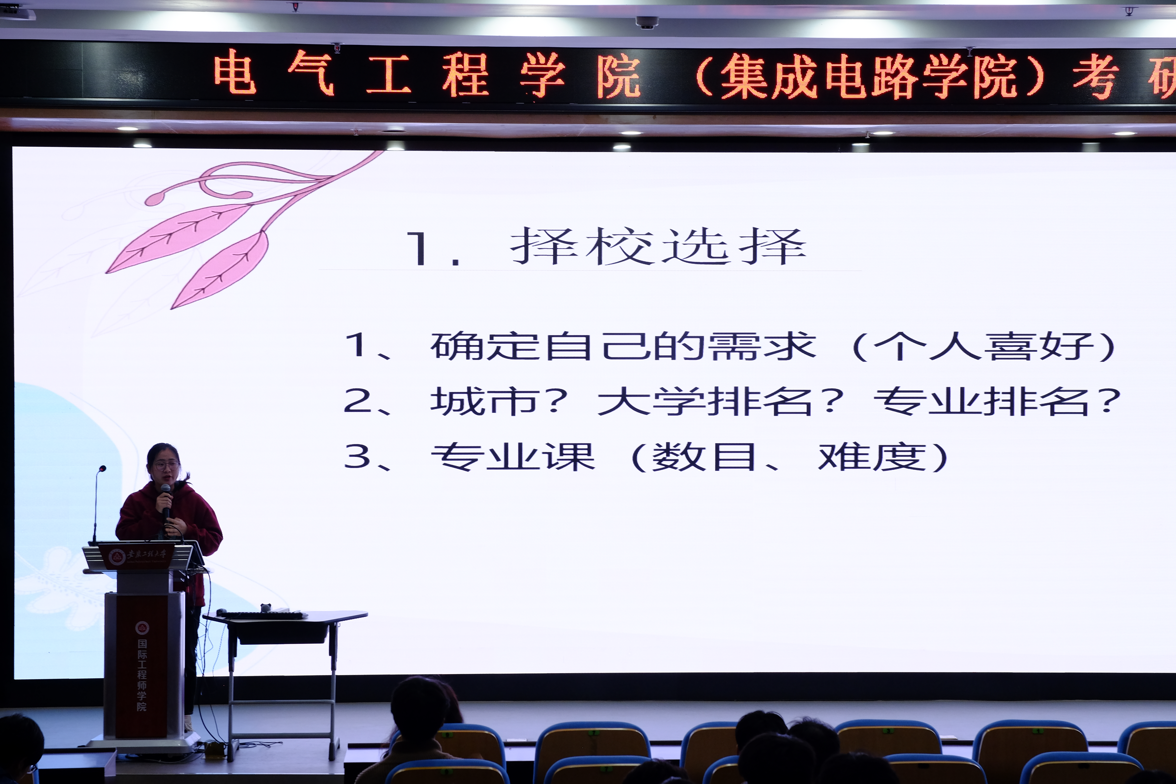 为了提高考研备考的针对性,此次分享会按照专业类别分为强电(自动化、电气、建电)和弱电(电子、电科、通信)两场进行,受邀分享考研经验的2019级考研优秀学生代表依次与同学们分享自己的考研心得和成功经验。他们以自身考研经验为例,从考研动机、院校选择、资料收集、网课选择、学习方法、计划安排、复试技巧、心态调整等方面作了详细介绍。内容生动有趣,会场气氛温馨热烈,与会同学纷纷表示收获颇多。