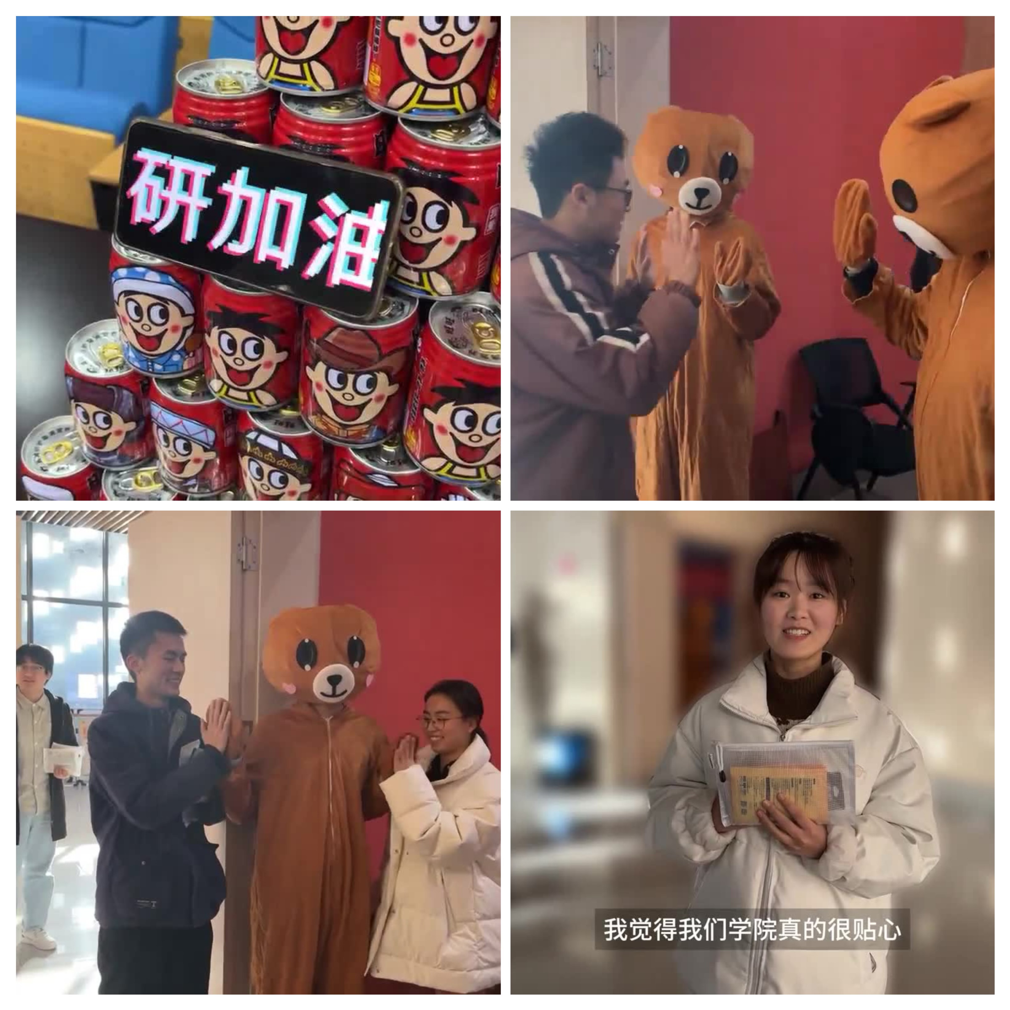 考前一个月,学院还开展考研送温暖活动。给学生发放文具用品、暖宝宝、旺仔牛奶的考研大礼包,举行“爱的抱抱”心理健康活动,为考研学子提供压力疏导和心理调适服务。同学们纷纷表示,在紧张的考研期间,学院的周到服务在寒冬时节给他们带来了极大的温暖,也增强了信心。