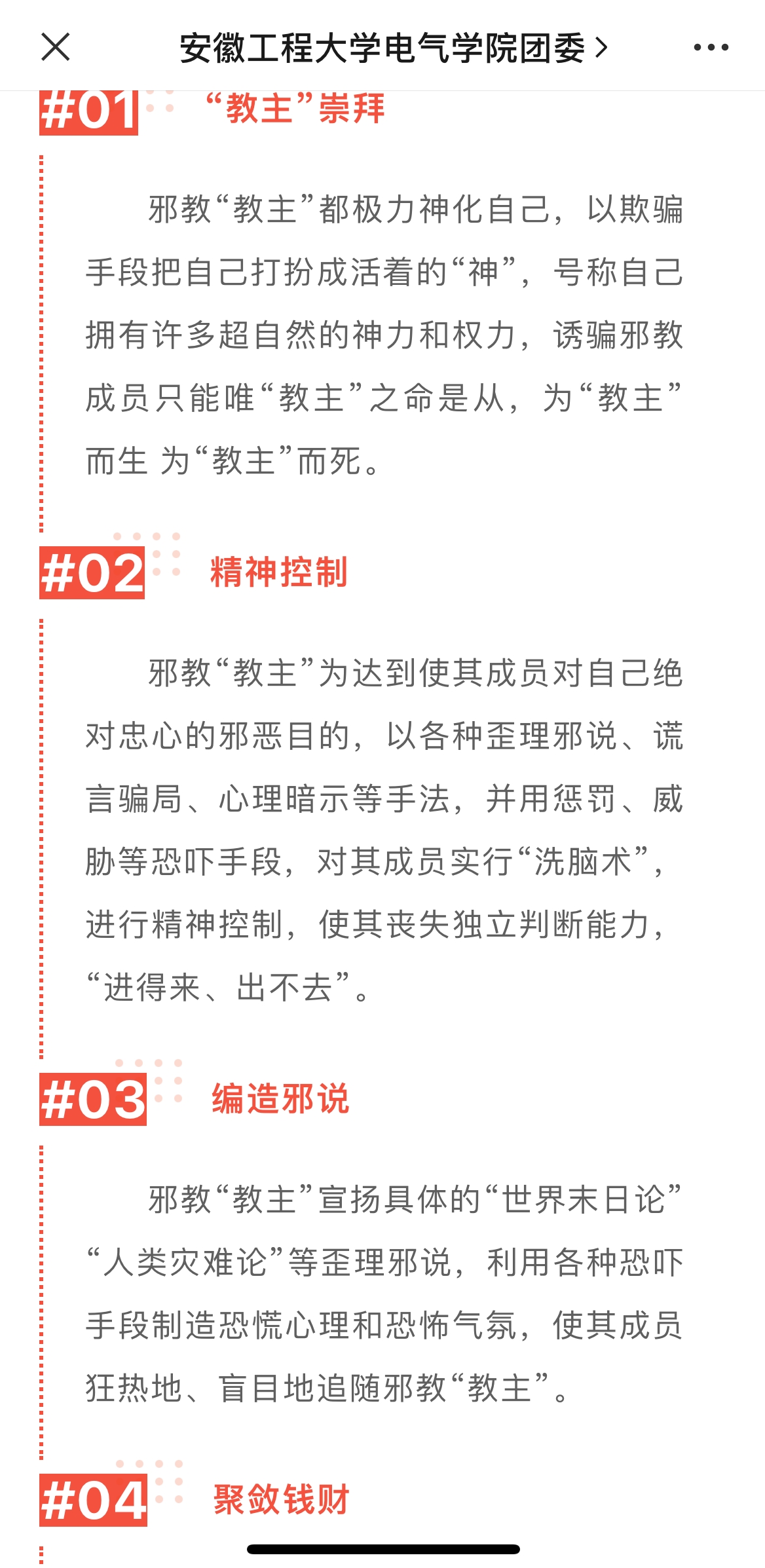 学院还通过团属新媒体发布反邪教科普文章,引导全体师生提高对邪教的警惕心,教育引导同学们防范时要做到四个“不”:不听、不看、不信、不传。