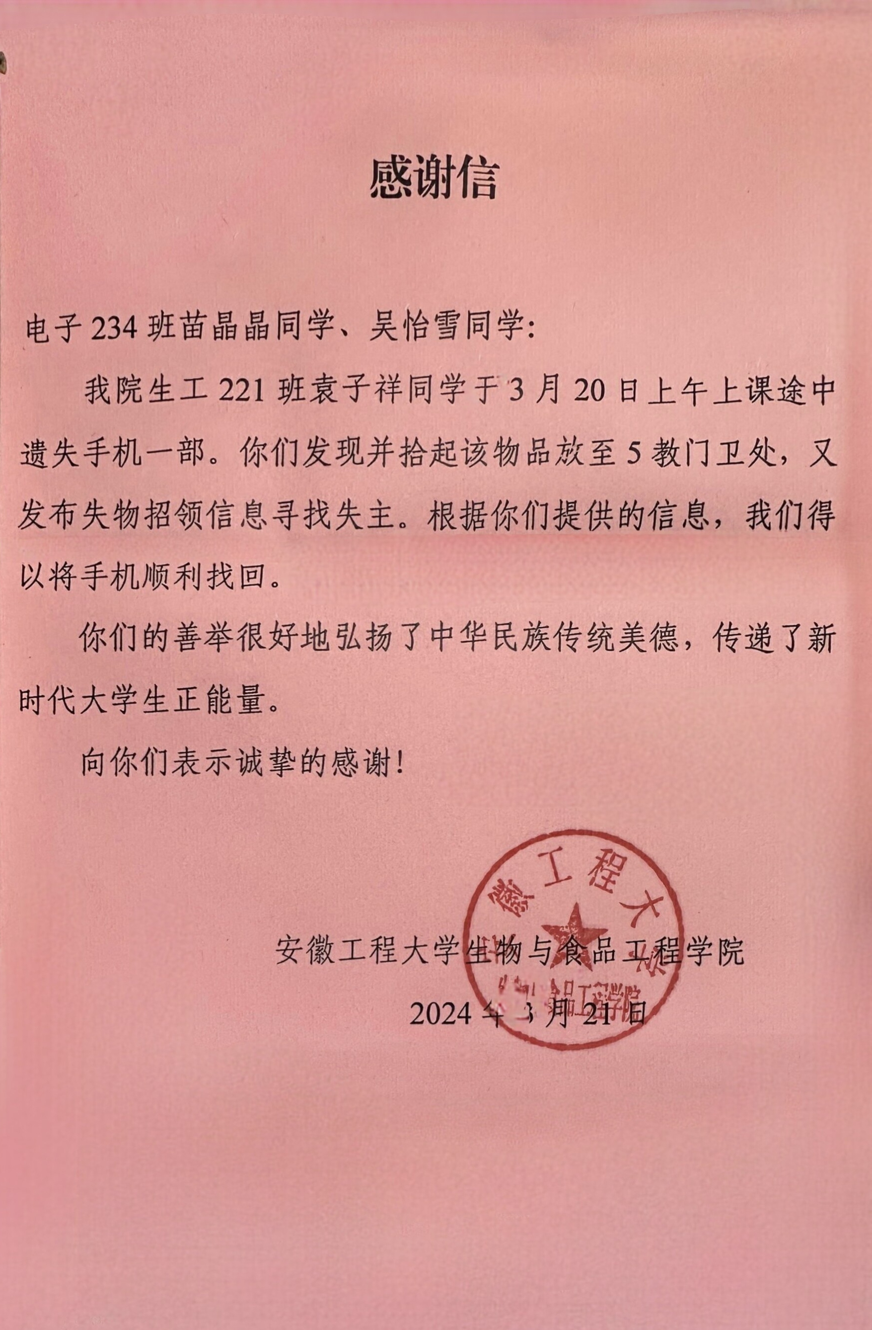 3月21日,小说狂人 (集成电路学院)收到了一封来自生物与食品工程学院的感谢信,信中表达了对电子234班苗晶晶、吴怡雪两位同学善心之举的感谢。