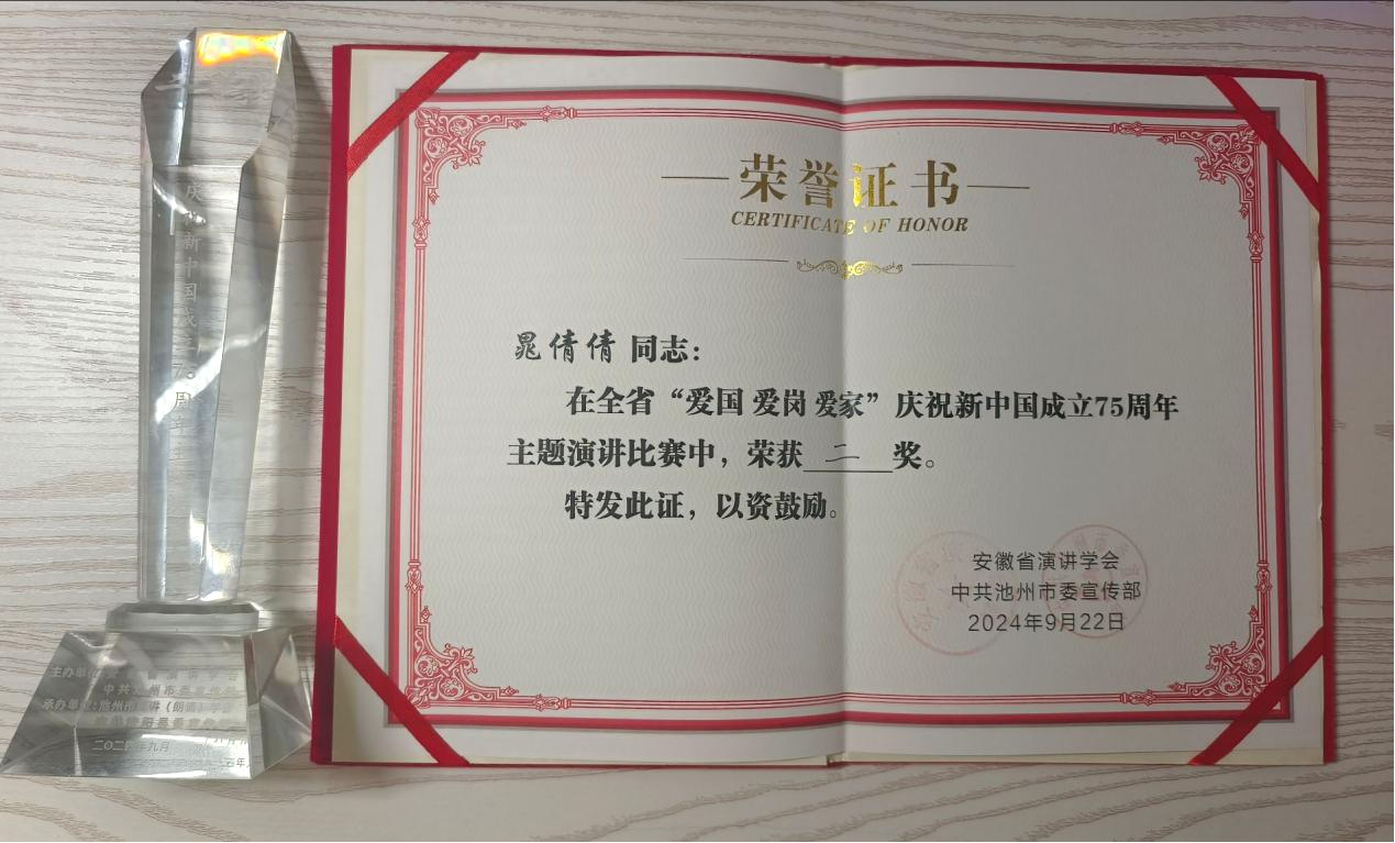 近日,由安徽省演讲学会和中共池州市委宣传部联合主办的全省“爱国 爱岗 爱家”主题演讲大赛在池州成功举办。小说狂人 (集成电路学院)电子233晁倩倩同学荣获省二等奖。