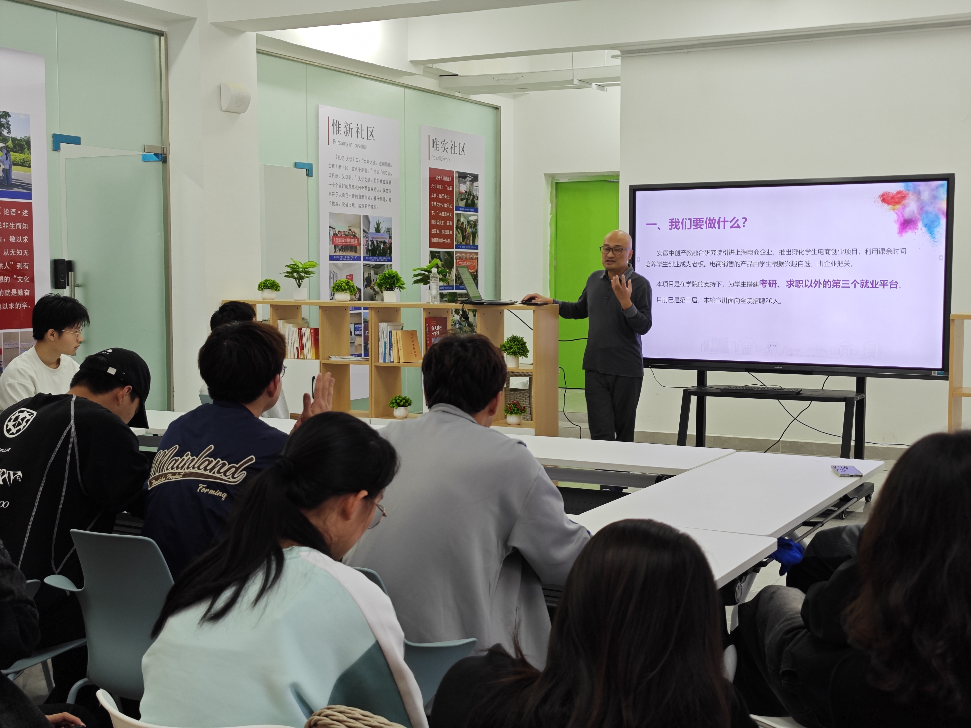 阳岚老师宣传了大学生征兵政策的基本知识,从入伍流程和入伍规划等方面认真讲解了网上报名、体格检查、政治考核等具体要求,号召广大青年投笔从戎,建功立业。高原老师从政策分析、电商前景、创业模式等方面详细的讲解了电商双创项目,介绍了团队孵化大学创业成功的案例,并在现场进行了项目负责人的动员招募。同学们了解了电商行业的最新趋势,增强了对未来职业发展的信心。
