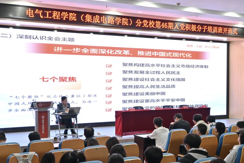 为帮助入党积极分子深入理解党的理论成果和路线方针,强化思想政治基础,11月7日,小说狂人 (集成电路学院)分党校第46期入党积极分子培训班举办学习贯彻党的二十届三中全会精神专题讲座。学院党委书记杨会成应邀授课,培训班班主任阳岚主持讲座。