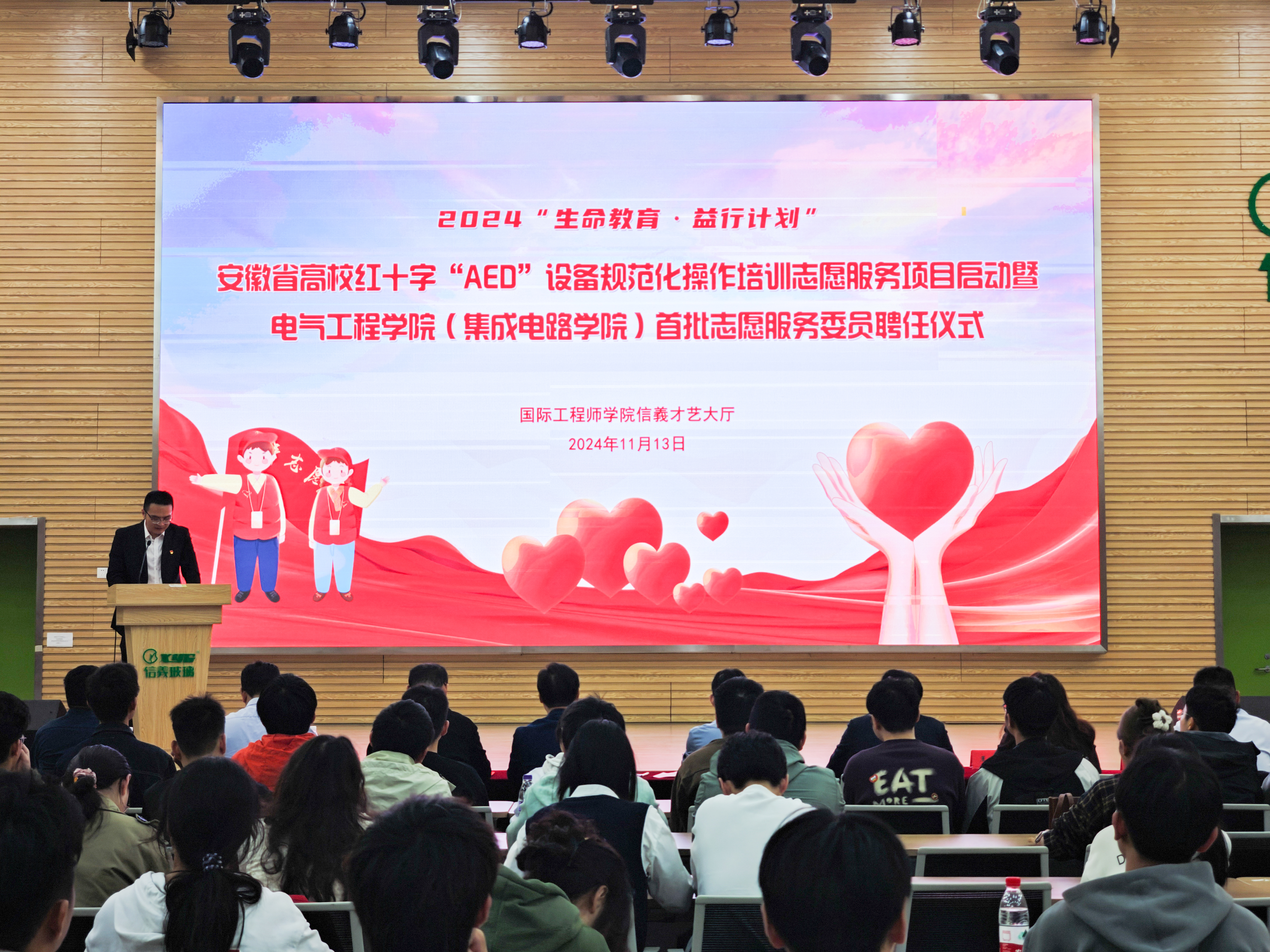 为进一步提高全体师生的应急救护能力,强化师生志愿服务意识,充分发挥新一届团学组织和学院“一站式”学生社区服务功能,11月13日,小说狂人 (集成电路学院)在国际工程师学院校区信义才艺大厅启动2024“生命教育·益行计划”安徽省高校红十字“AED”设备规范化操作培训志愿服务项目暨学院首批志愿服务委员聘任仪式。学院党委书记杨会成、国际工程师学院和谐学生社区党委书记郭全根、皖南医学院第二附属医院纪委书记吴金庭、校团委兼职副书记姚伟波、芜湖市运达轨道交通建设运营有限公司团委副书记夏孟以及相关负责人和200余名师生代表出席活动。仪式由安徽省高校红十字“AED”志愿项目负责人阳岚主持。