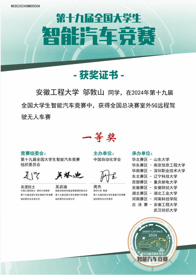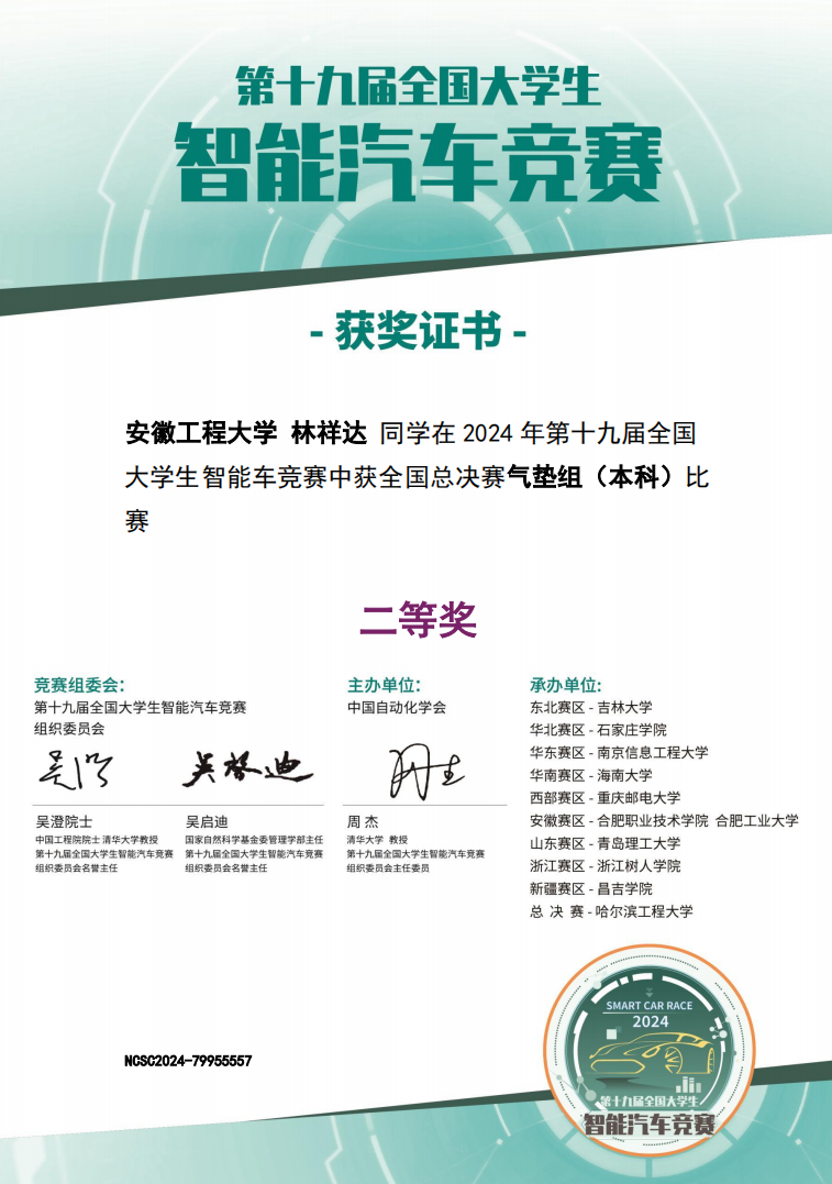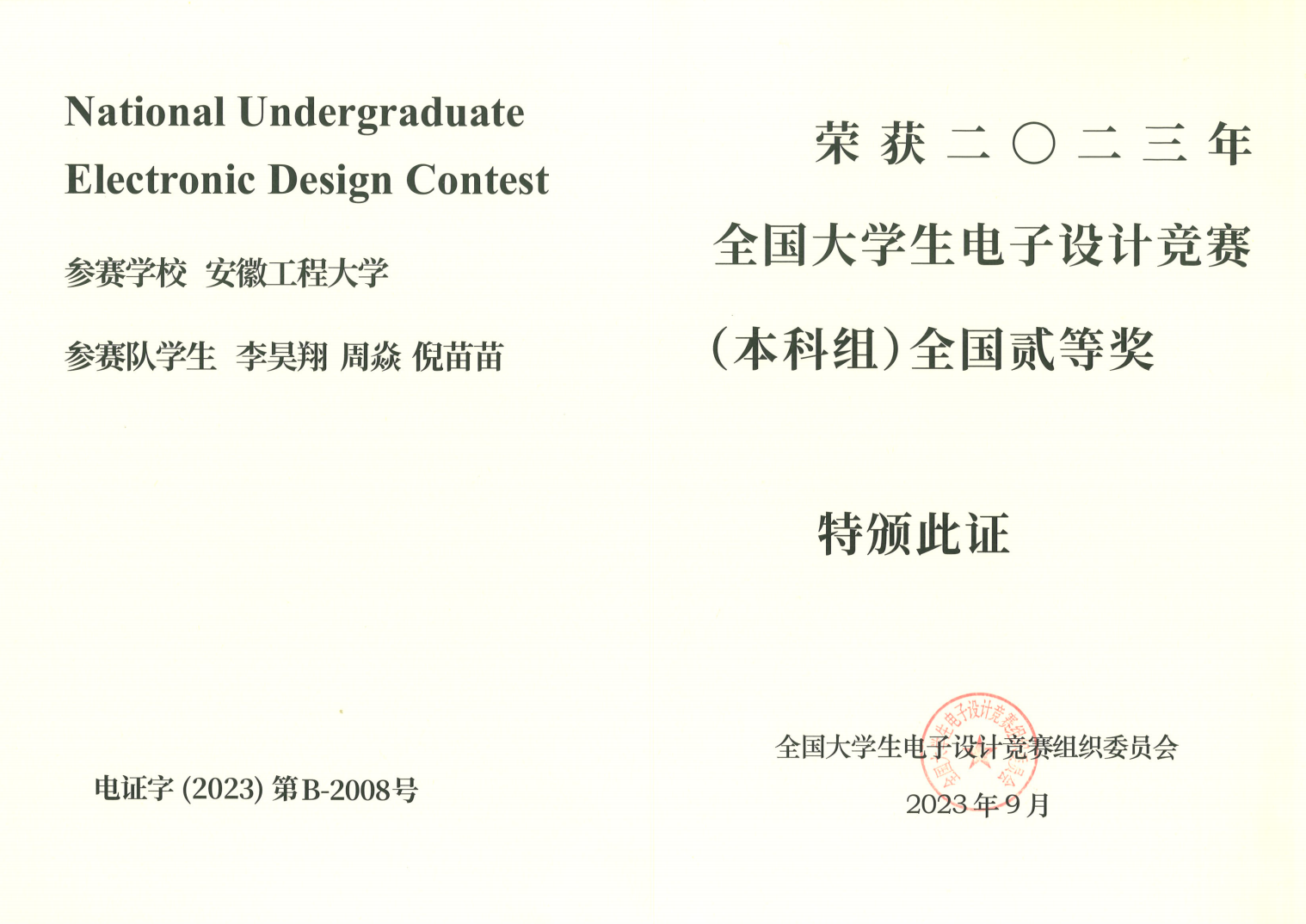 在第十九届全国大学生智能汽车竞赛中,协会共有两队获得全国一等奖,三队获得全国二等奖,一队获得全国三等奖。在2023年举办的上届全国大学生电子设计竞赛(国赛)中,共有三队获得国家级奖项。以下为协会成员在全国大学生智能汽车竞赛和全国大学生电子设计竞赛中的部分获奖证书。