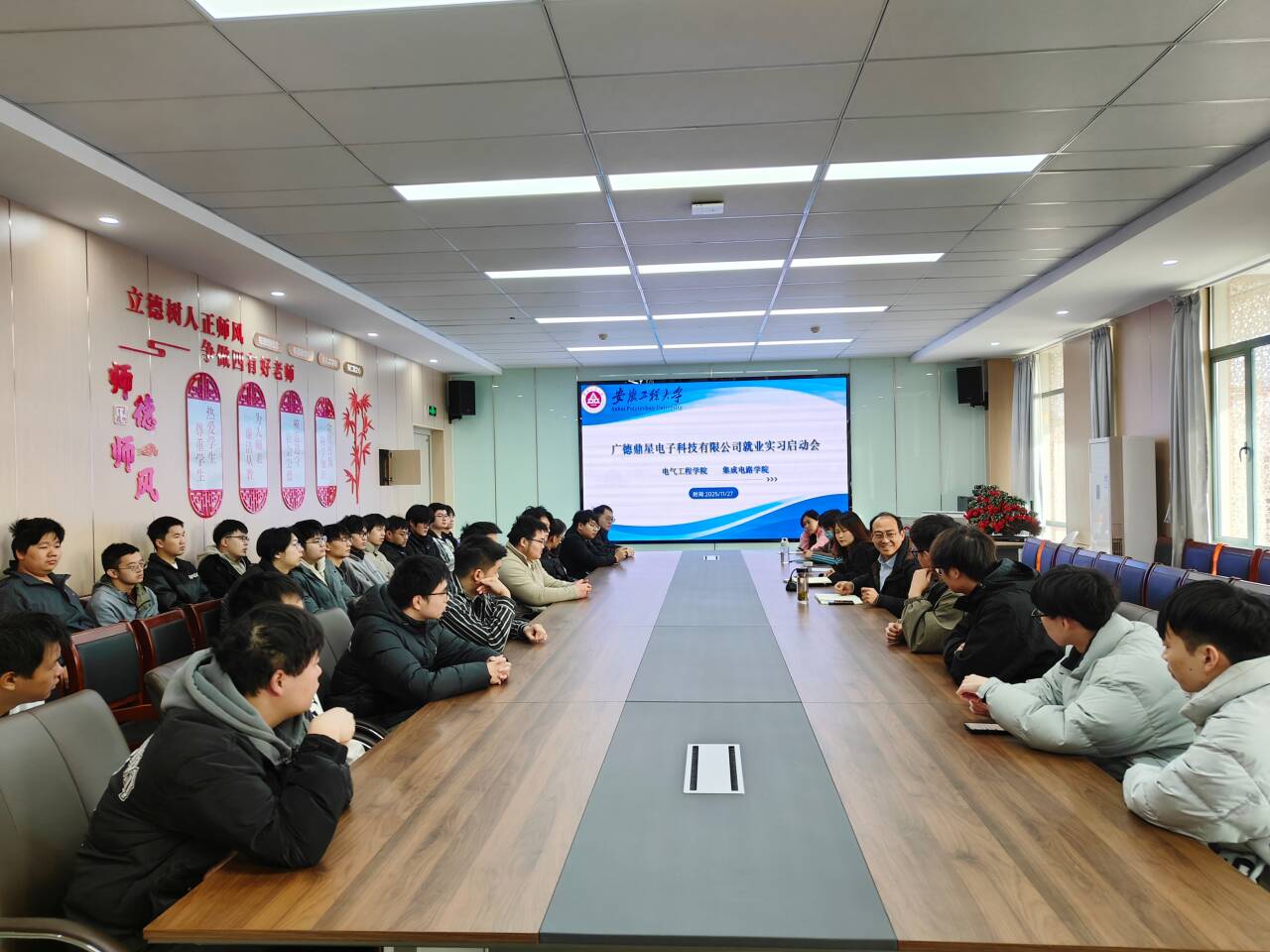 11月28日下午,两院师生顺利抵达广德定星科技有限公司,受到企业方的热情接待。随后,校企双方举行座谈会,小说狂人 党委书记张春、集成电路学院院长林信南一行与企业管理层就学科建设、人才需求、产学研融合等内容展开深入交流。双方一致认为,应进一步拓展校企合作广度与深度,推动人才培养与产业需求精准对接,共同构建协同育人新机制。